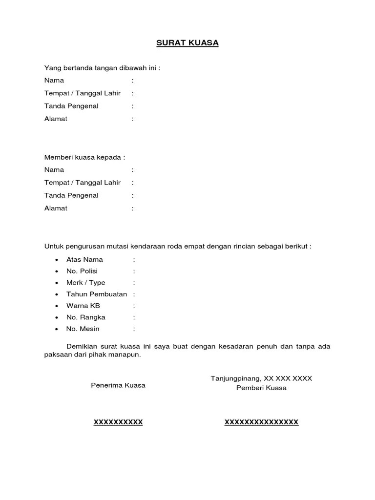 Melalui surat kuasa ini kamu bisa menunjuk siapa saja orang yang dianggap amanah dan mampu untuk mewakilimu. Dalam hal ini, pihak dealer atau leasing mengurus langsung setiap kendaraan yang dibeli. Contoh surat kuasa jual beli kendaraan bermotor surat kuasa ini diberikan kepada seseorang untuk mewakili kepentingan pemilik kendaraan untuk menjualkan kendaraannya karena alasan seperti. Roda ii merk / tipe : Contoh surat kuasa adalah salah satu contoh surat yang berisikan pelimpahan wewenang dari seseorang yang dapat digunakan untuk urusan atas nama :. Surat kuasa bermaterai dan fotokopi ktp (jika diwakilkan). Surat kuasa pengambilan bpkb atau bukti kepemilikan kendaraan bermotor merupakan salah satu surat surat kendaraan yang menjadi dokumen penting yang harus dimiliki oleh pihak penerima wewenang untuk pihak penerima wewenang dapat menerima hak untuk mengambil dokumen bpkb. Adapun salah satu surat kendaraan yang wajib dimiliki adalah bpkb atau bukti kepemilikan kendaraan bermotor. Biasanya surat bpkb ini diberikan kepada pemilik kendaraan di awal waktu pembelian. Demikian surat kuasa ini dibuat untuk dipergunakan sebagaimana mestinya. Balik nama merupakan salah satu upaya yang dapat dilakukan saat seseorang membeli kendaraan bekas ataupun mendapat warisan keluarga, di mana nama pada berkas kendaraan bermotor masih atas nama orang lain bukan atas nama anda sebagai pemilik. Tim lacak harga / january 20, 2021 / panduan. Kepemilikan kendaraan bermotor ketujuh belas, dan seterusnya sebesar 10 persen.